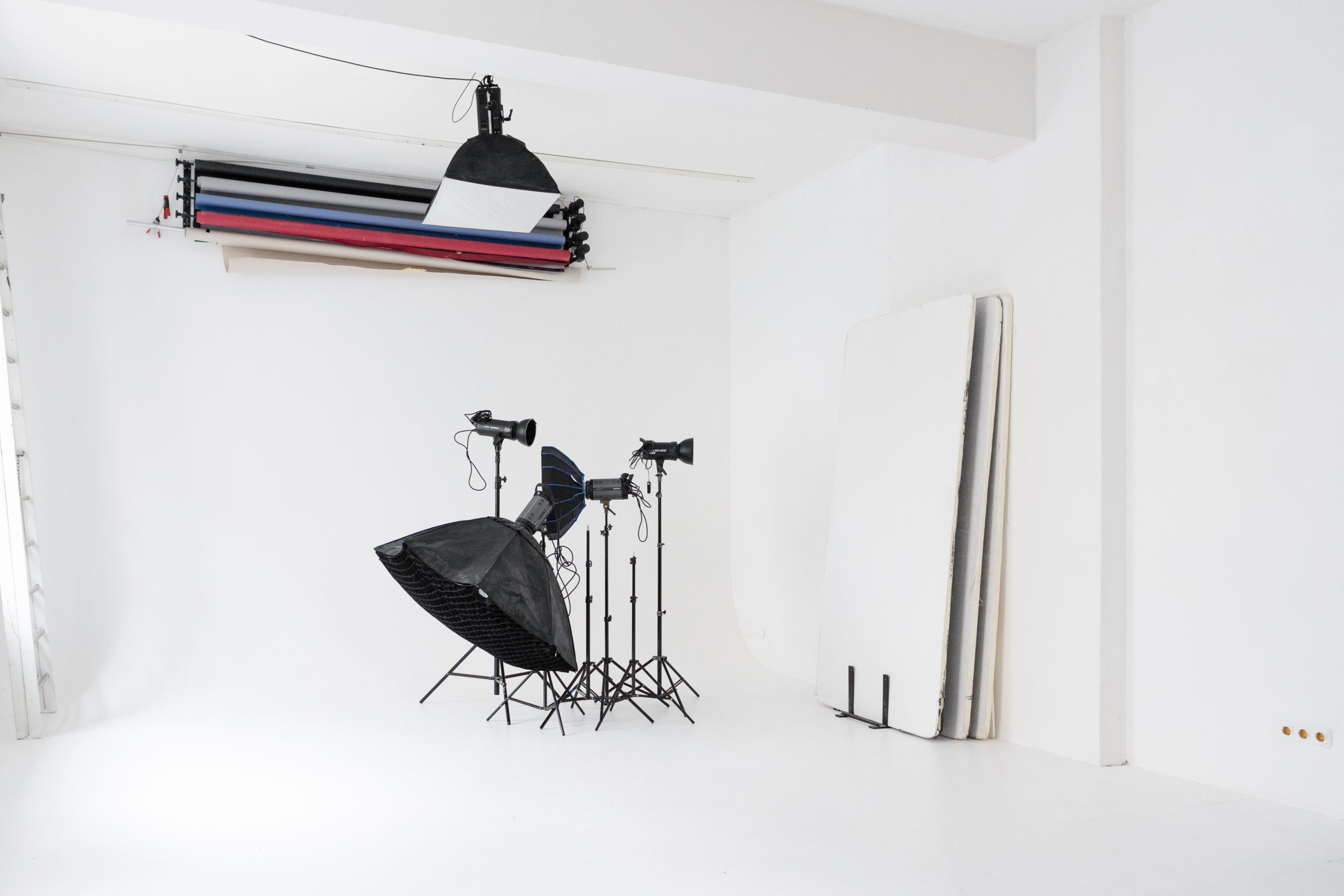 Licht und Lichtformer, Stative sind in der Studiomiete inklusive. Hintergrundnutzung nach Absprache.